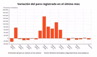Variación mensual del paro en España en febrero, en meses comparables, febrero de 2020 (Ministerio de Trabajo) - EPDATA