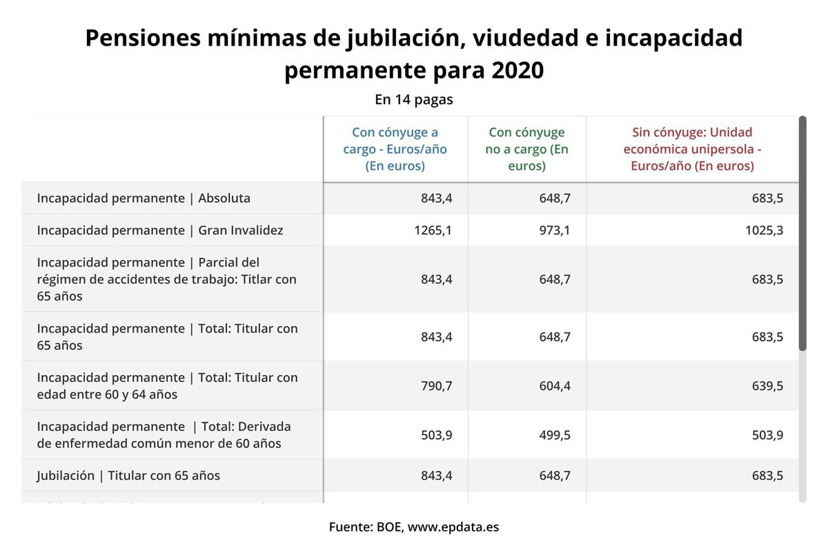 Pensiones mínimas de jubilación, viudedad e incapacidad permanente para 2020 (BOE) - EPDATA