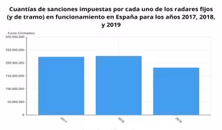 Cuantías de sanciones impuestas por cada uno de los radares fijos (y de tramo) en funcionamiento en España en 2017, 2018 y 2019 (DGT) - EPDATA