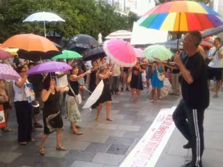 Con el lema 'Se lo están comiendo todo, con la que está cayendo', los afectados han acudido provistos de paraguas, bocinas y pancartas contrarias al ERE municipal. Además, en numerosas ocasiones han bailado la canción de David Civera 'Que la detengan', haciendo referencias a la alcaldesa de la localidad, la 'popular' María José García-Pelayo.