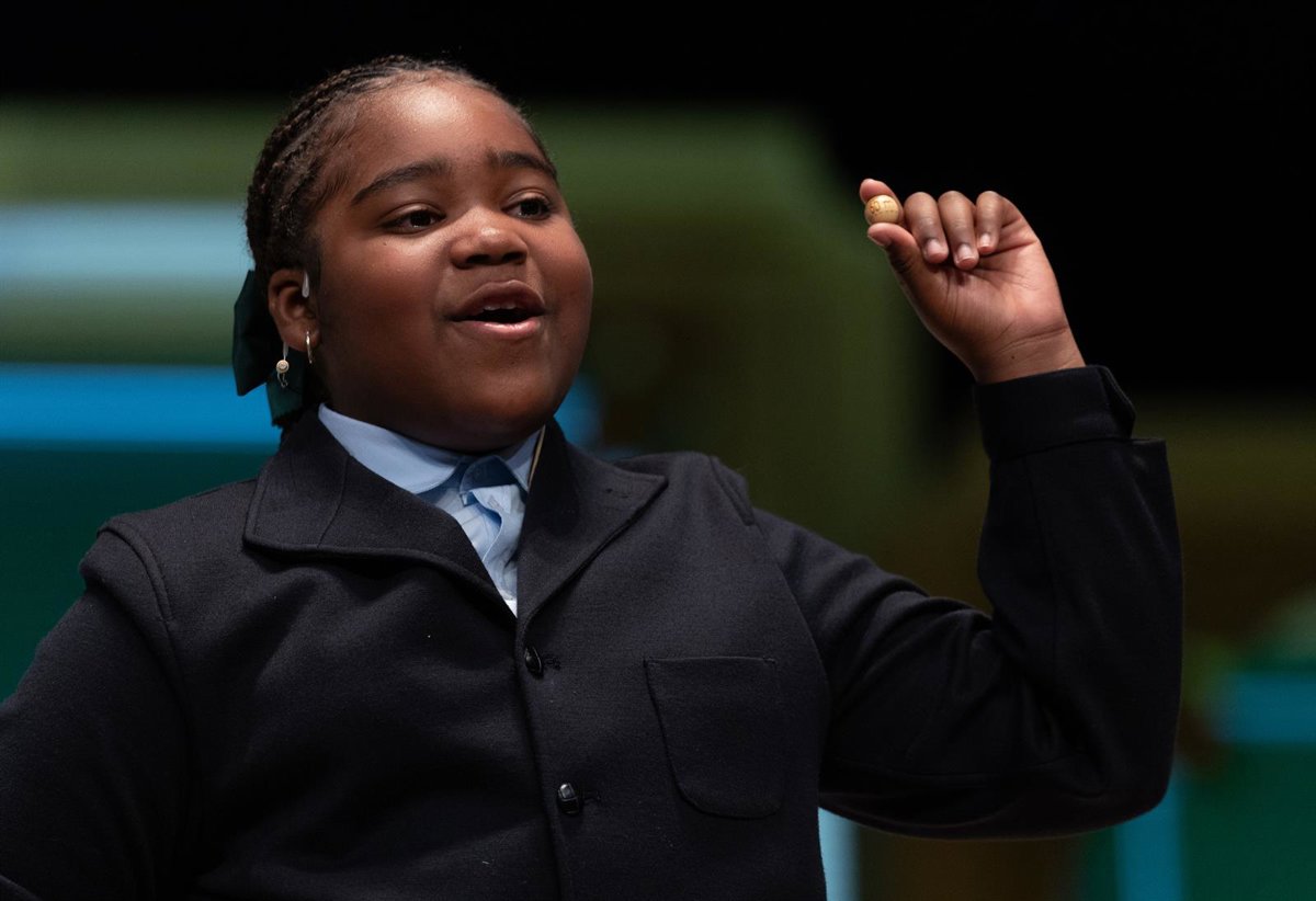 Ainhoa Rosero Gómez canta un quinto premio, el número 92.023, durante el Sorteo Extraordinario de la Lotería de Navidad 2023 en el Teatro Real de Madrid, a 22 de diciembre de 2023, en Madrid (España). - Eduardo Parra - Europa Press
