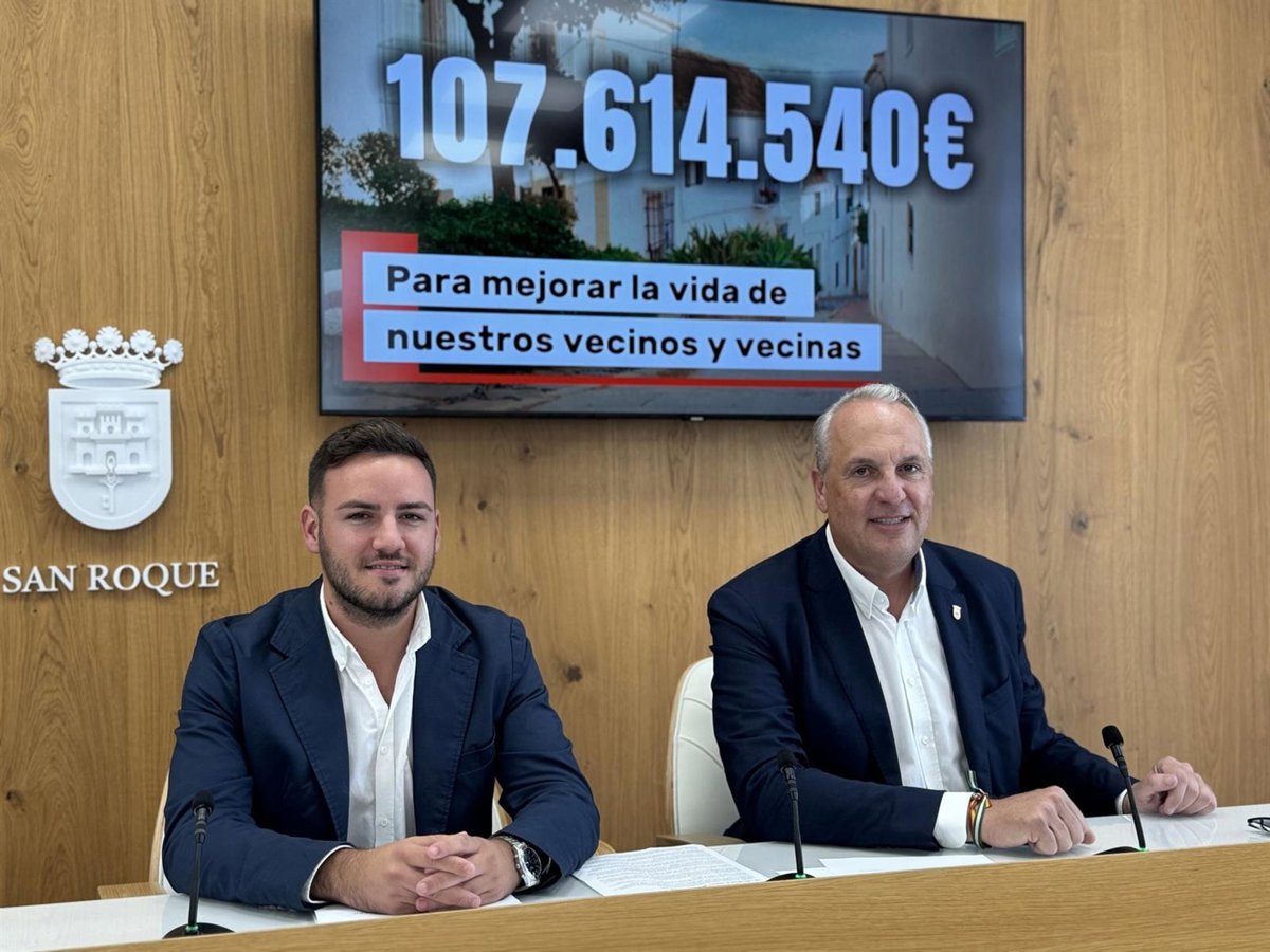El alcalde de San Roque (Cádiz), Juan Carlos Ruiz Boix, y el teniente de alcalde de Hacienda, Fernando Vega, han presentado el documento inicial del Presupuesto General del Ayuntamiento para 2026 con una cifra final que supera los 107,6 millones de euros, 14,2 millones más que en el ejercicio actual, lo que supone un incremento del 15%.