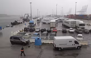 Imagen de camiones parados en los accesos al puerto de Algeciras cerrados tras la cancelación de todas las conexiones marítimas con Ceuta y Tánger debido a las condiciones adversas generadas por la borrasca. - Nono Rico / Europa Press