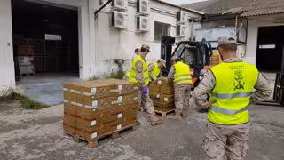 Infantes de Marina con el material para instalación del albergue provisional en Club Náutico Elcano - ARMADA ESPAÑOLA