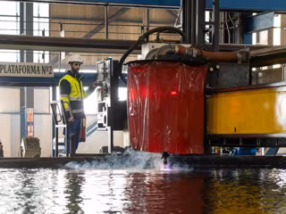 A continuación, y tras pulsar el botón de puesta en marcha, se ha iniciado el corte en la piscina de plasma. La construcción ha comenzado después de que en 2023 el astillero ya pusiera a prueba las nuevas herramientas digitales de diseño, control y gestión con la construcción de un bloque piloto.