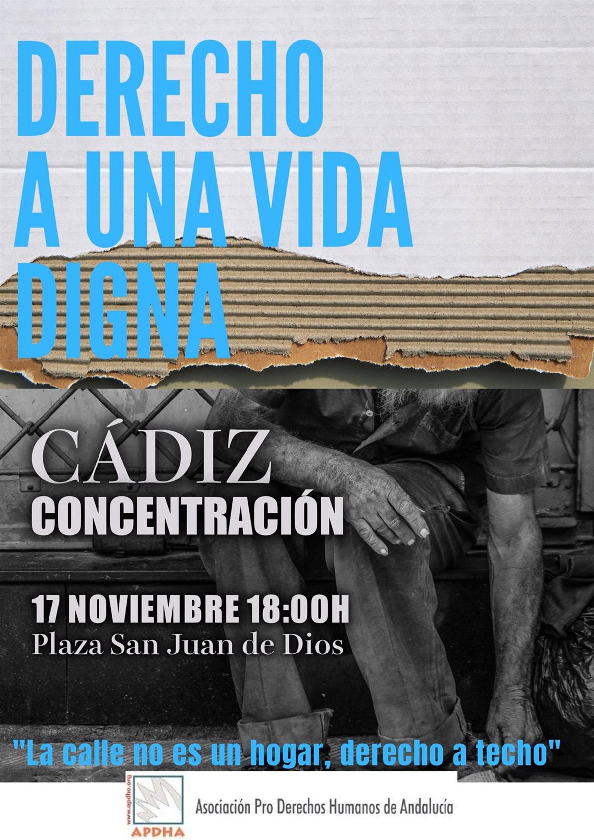 Bajo el lema 'Por una vida digna. La calle no es un hogar', la Asociación Pro Derechos Humanos (Apdha) ha convocado el próximo jueves 17 de noviembre a las 18,00 horas una concentración en la Plaza San Juan de Dios de Cádiz, con motivo del Día Mundial de las Personas sin Hogar, para recordar la "responsabilidad" de las administraciones públicas y exigir una "atención plena" a este colectivo "tan castigado".