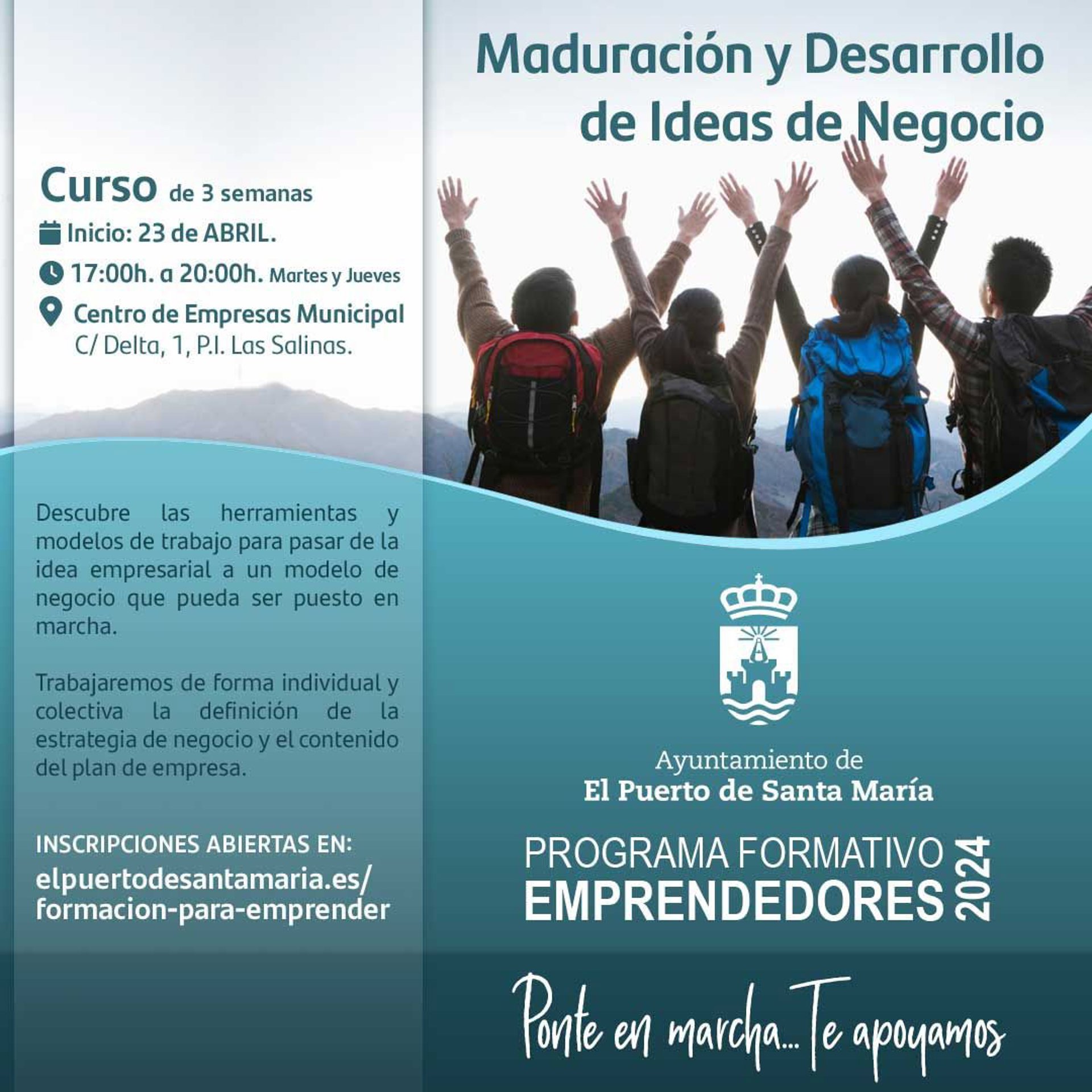 El Ayuntamiento de El Puerto de Santa María (Cádiz) ha puesto en marcha, dentro del Programa Formativo para Emprendedores 2024, un Aula de Maduración y Desarrollo de Ideas de Negocio que dará inicio el próximo 23 de abril. La actividad está enfocada en facilitar a los participantes el estudio y desarrollo de sus iniciativas empresariales mediante la utilización de herramientas y técnicas de trabajo que les permita pasar de la idea de negocio a tener un modelo que pueda materializarse, ayudándoles a analizar el mercado y la viabilidad de sus proyectos.