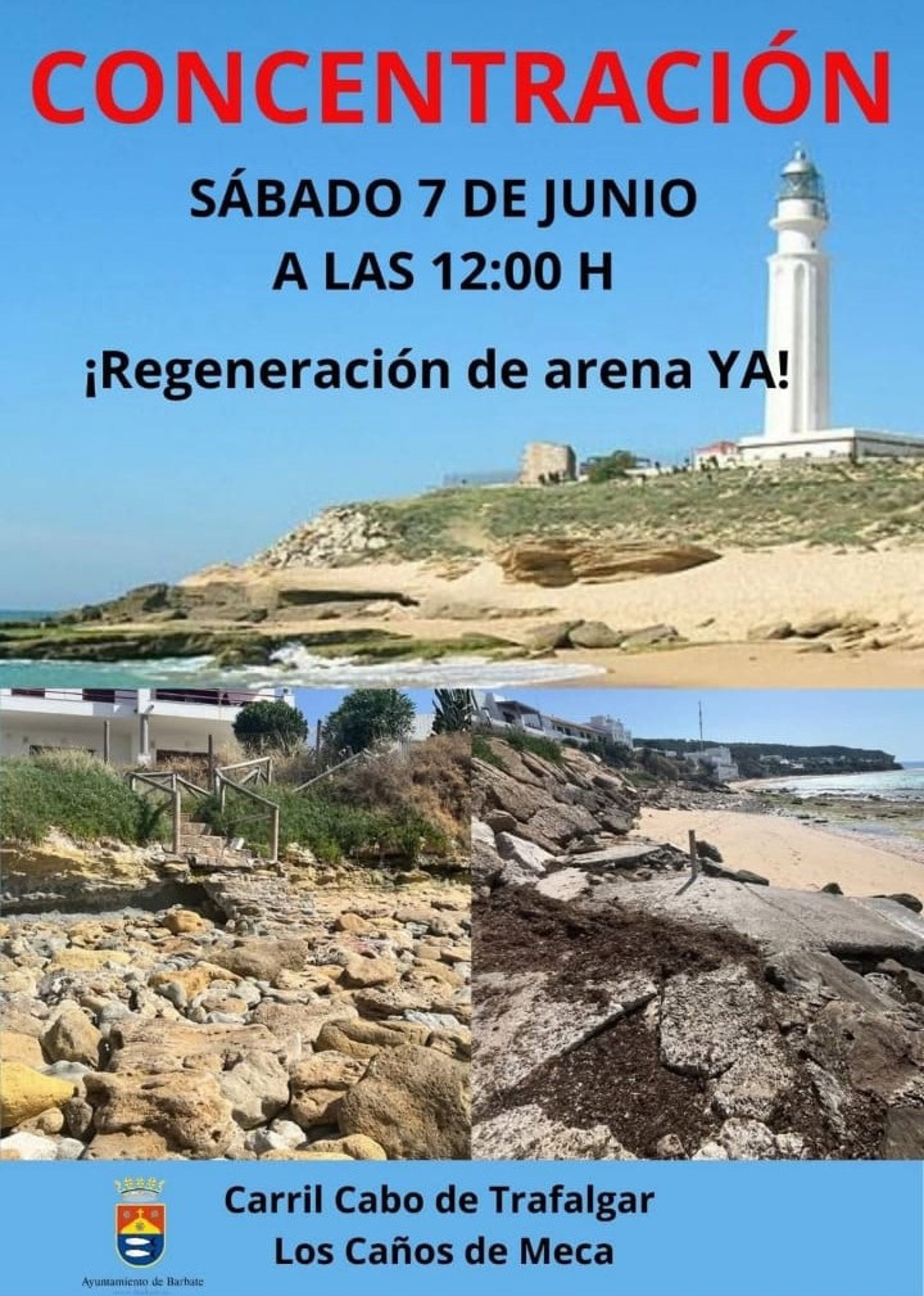 El Ayuntamiento de Barbate (Cádiz) ha convocado para este sábado en Los Caños de Meca una concentración para reivindicar a la Demarcación de Costas la regeneración de la playa y "protestar por la retirada de arena de la carretera del Faro hacia otras playas de la provincia, como es la de Puerto Real".