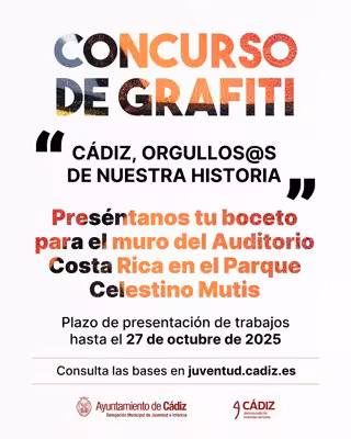 La Delegación Municipal de Juventud e Infancia convoca el Concurso de Grafiti 'Cádiz, orgullos@s de nuestra historia' con el objetivo de seleccionar la propuesta artística que dará forma a un gran mural en el muro trasero del auditorio Costa Rica, en el parque Celestino Mutis.