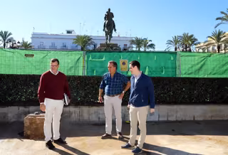 El teniente de alcaldesa de Servicios Públicos del Ayuntamiento de Jerez de la Frontera, Jaime Espinar, ha supervisado el desarrollo de los trabajos de impermeabilización que se están acometiendo en la fuente de la Plaza Arenal, al objeto de evitar las filtraciones de agua que se venían produciendo en una zona ajardinada del monumento a caballo de Miguel Primo de Rivera, obra de Mariano Benlliure.