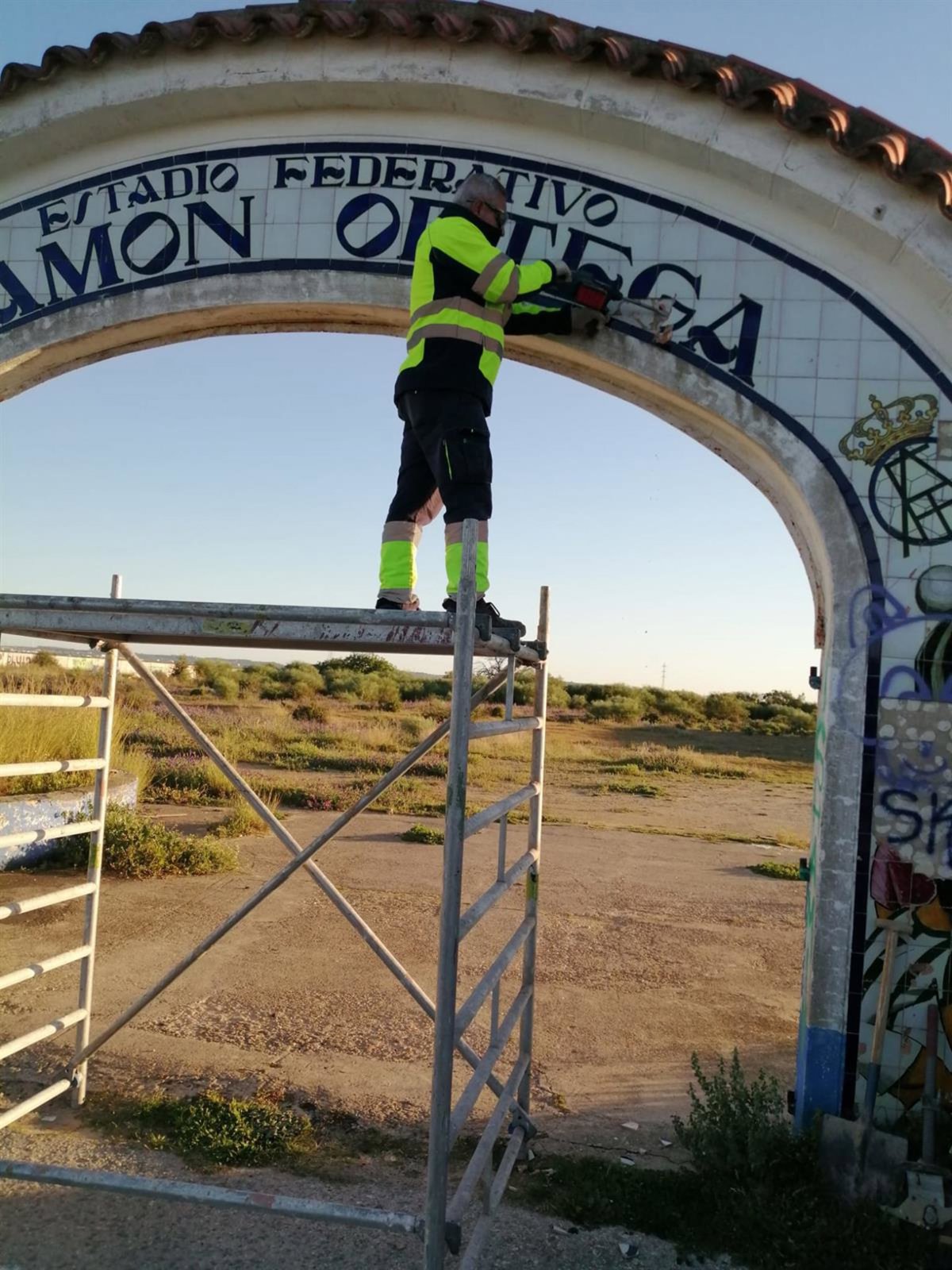 Operario municipal eliminando el nombre de Ramón Ortega, relacionado con el franquismo, del estadio deportivo de Puerto Real - AYUNTAMIENTO DE PUERTO REAL