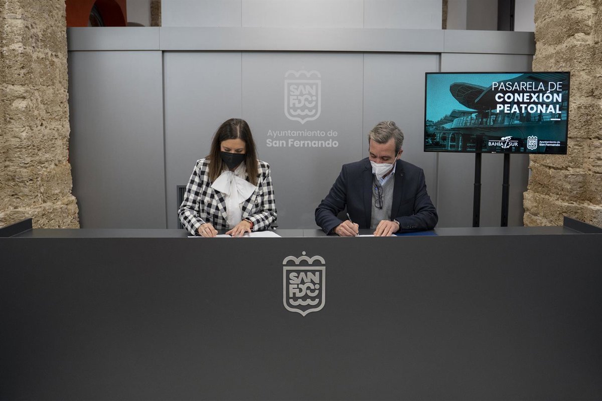 La culminación de esta pasarela es fruto de un acuerdo en ejecución alcanzado entre el Ayuntamiento de San Fernando, Adif y el centro comercial Bahía Sur. Este acuerdo en ejecución ha sido firmado por la alcaldesa de San Fernando, Patricia Cavada, y el presidente de la Comunidad de Propietarios de Bahía Sur, Julio García.