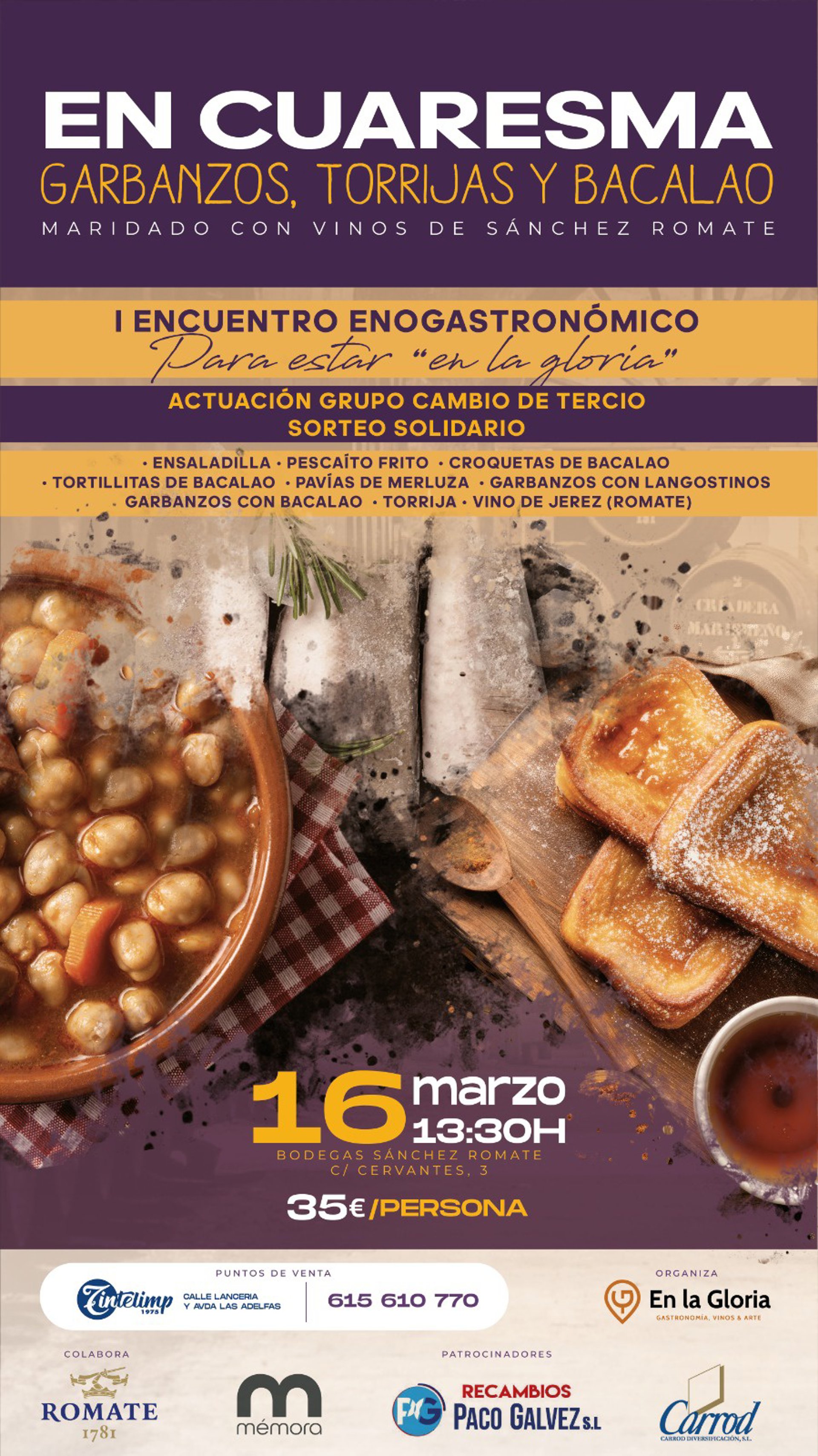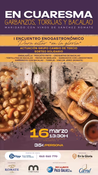 Las entradas para el evento están ya disponibles a un precio de 35 euros por persona. Con ella, se tendrá acceso a la Bodega Sánchez Romate (calle Cervantes, 13) a partir de las 13,30 horas del sábado 16 de marzo. Se podrá disfrutar de un menú compuesto por ensaladilla, pescado frito, croquetas de bacalao, pavías de merluza, garbanzos con langostino, garbanzos con bacalao, vino de Jerez (Bodega Sánchez Romate) y torrijas.