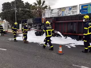 Bomberos del Consorcio Provincial de Cádiz en el parque de El Puerto de Santa María han intervenido desde el mediodía de este lunes en un accidente de tráfico que se producía tras el vuelco de un camión trailer en la avenida Felipe VI, a la altura de la Glorieta 501. El vehículo iba cargado de balas de cartón: su conductor consiguió salir por su propio pie resultando ileso. A causa del vuelco se rompió el depósito de gasoil de 1.000 litros de capacidad, produciendo un derrame sobre la calzada.