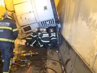 Efectivos del Consorcio de Bomberos de la Provincia de Cádiz tratan de recuperar el cadáver del conductor de un vehículo que quedó "aplastado" bajo un camión accidentado en la mañana de este miércoles en el túnel del Acceso Norte al puerto de Algeciras (Cádiz).