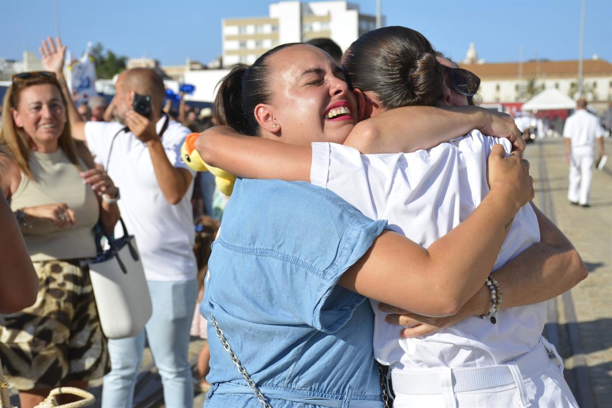 Familiares se abrazan con una tripulante de Elcano en el puerto de Cádiz tras el XCV Crucero de Instrucción . - ARMADA ESPAÑOLA