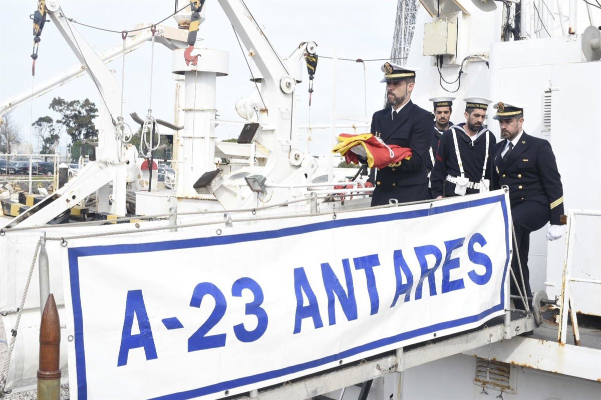 La Armada ha despedido este viernes en la estación de Puntales, en Cádiz, a su histórico buque hidrográfico 'Antares', que ha dejado de prestar servicio tras 50 años de actividad, en un acto presidido por el almirante jefe del Arsenal de Cádiz, el vicealmirante Rubén Rodríguez Peña.