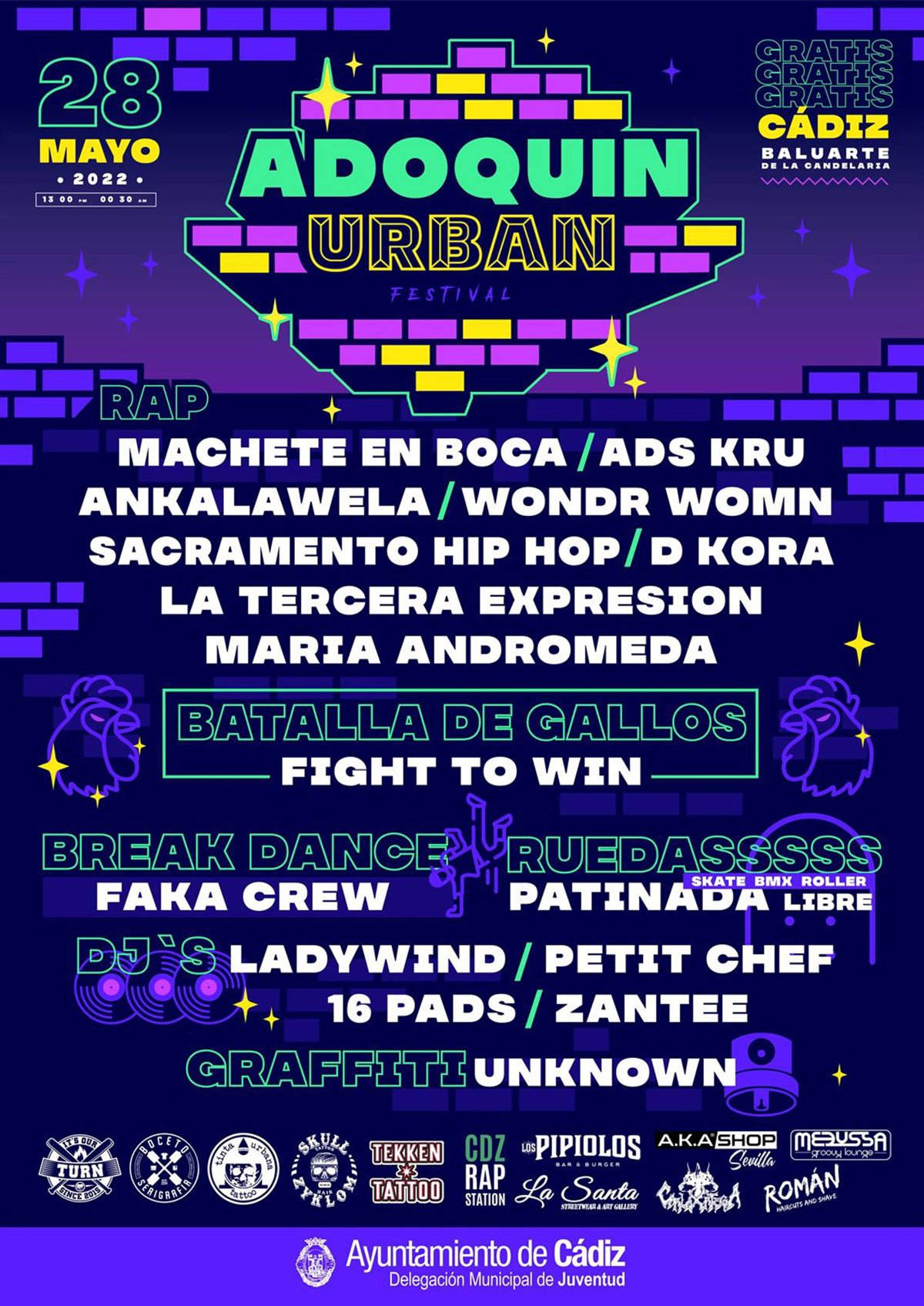 El próximo 28 de mayo, bajo la organización de la delegación de Juventud del Ayuntamiento de Cádiz y el colectivo CDZ Rap Station, se celebrará el 'Adoquín Urban Festival' en el Baluarte de la Candelaria a partir de las 12,00 horas, un evento enfocado en la cultura urbana del hip hop de la provincia de Cádiz.