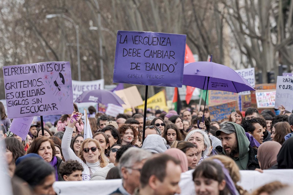 Persona porta pancarta con lema 'La vergüenza debe cambiar de bando' durante la manifestación convocada por la Comisión 8M por el Día de la Mujer, a 8 de marzo de 2026, en Madrid (España). - Diego Radamés - Europa Press