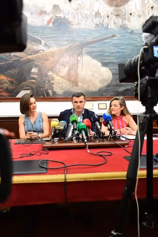 El alcalde de Cádiz, Bruno García, junto a las tenientes de alcalde de Cultura, Maite González, y de Turismo, Beatriz Gandullo, ha presentado este martes la primera edición del programa municipal 'Orgullos@s de nuestra historia', que estará dedicada a Cádiz Fenicia.