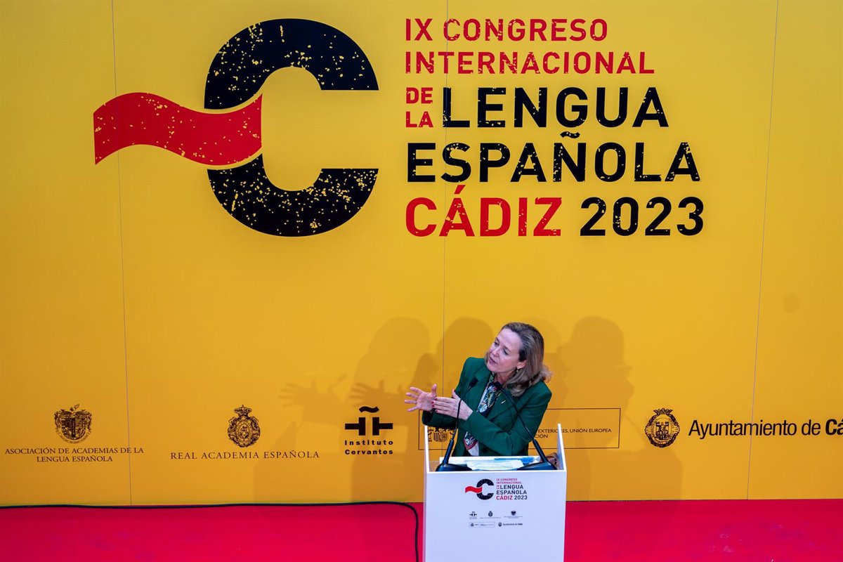 En declaraciones a los periodistas tras intervenir en la sesión plenaria de este miércoles en el Congreso Internacional de La Lengua Española que se está celebrando en Cádiz, Calviño ha presentado el llamado Perte de la nueva economía de la lengua, financiado con los fondos europeos Netx Generation, para que "el español ocupe el espacio que le corresponde en la nueva economía digital".