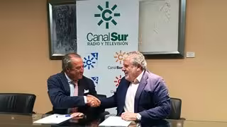 El director de Canal Sur Radio y Televisión (CSRTV), Joaquín Durán, y el presidente de la Sociedad de Carreras de Caballos de Sanlúcar de Barrameda, Rafael Hidalgo, han firmado este miércoles en la sede central de Csrtv en Sevilla el convenio para difundir, a través de Canal Sur Televisión, todas las actividades que organice dicha Sociedad a lo largo del año y en especial las Carreras de Caballos que se celebrarán en agosto, así como la Semana Hípica.