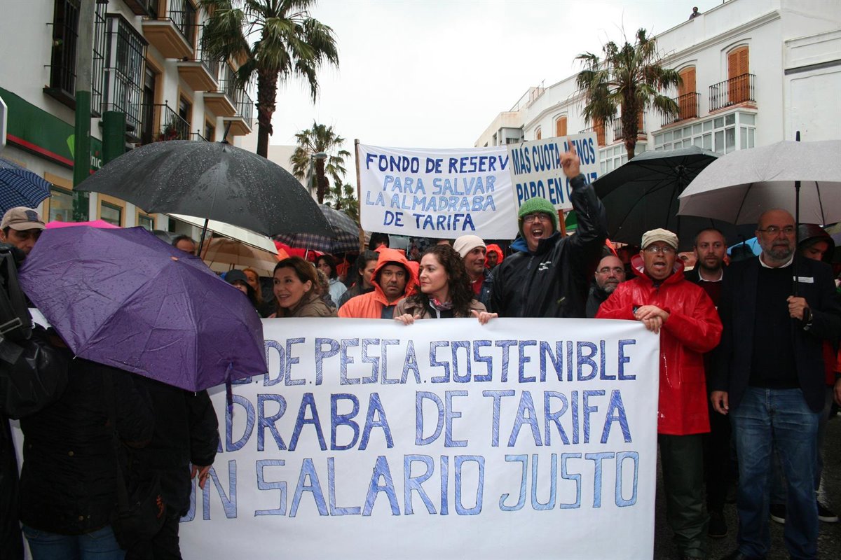 Los almadraberos de Tarifa (Cádiz) han recibido este jueves el apoyo de "más de 200 personas" que, pese a la lluvia, han participado en la manifestación convocada para reclamar al Gobierno central las 20 toneladas del fondo de maniobra que consideran "imprescindibles" para poder garantizar su "subsistencia".