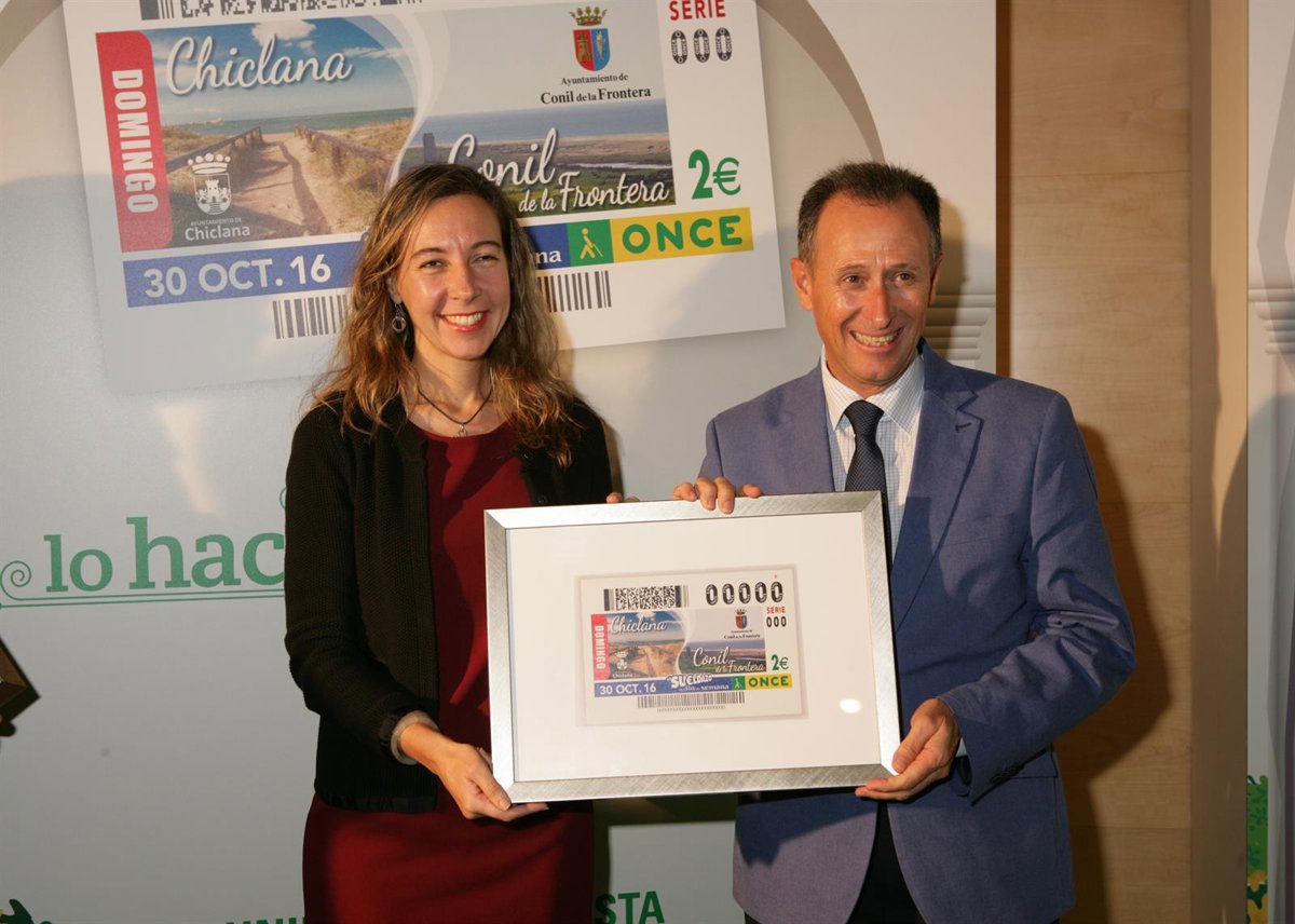 El director general de la ONCE, Ángel Sánchez, y la vicepresidenta de la organización, Patricia Sanz, que participan en las jornadas, han presentado la imagen de este cupón a los alcaldes Chiclana de la Frontera, José María Román, y de Conil de la Frontera, Juan Manuel Bermúdez, del que ambas localidades serán protagonistas este sábado.