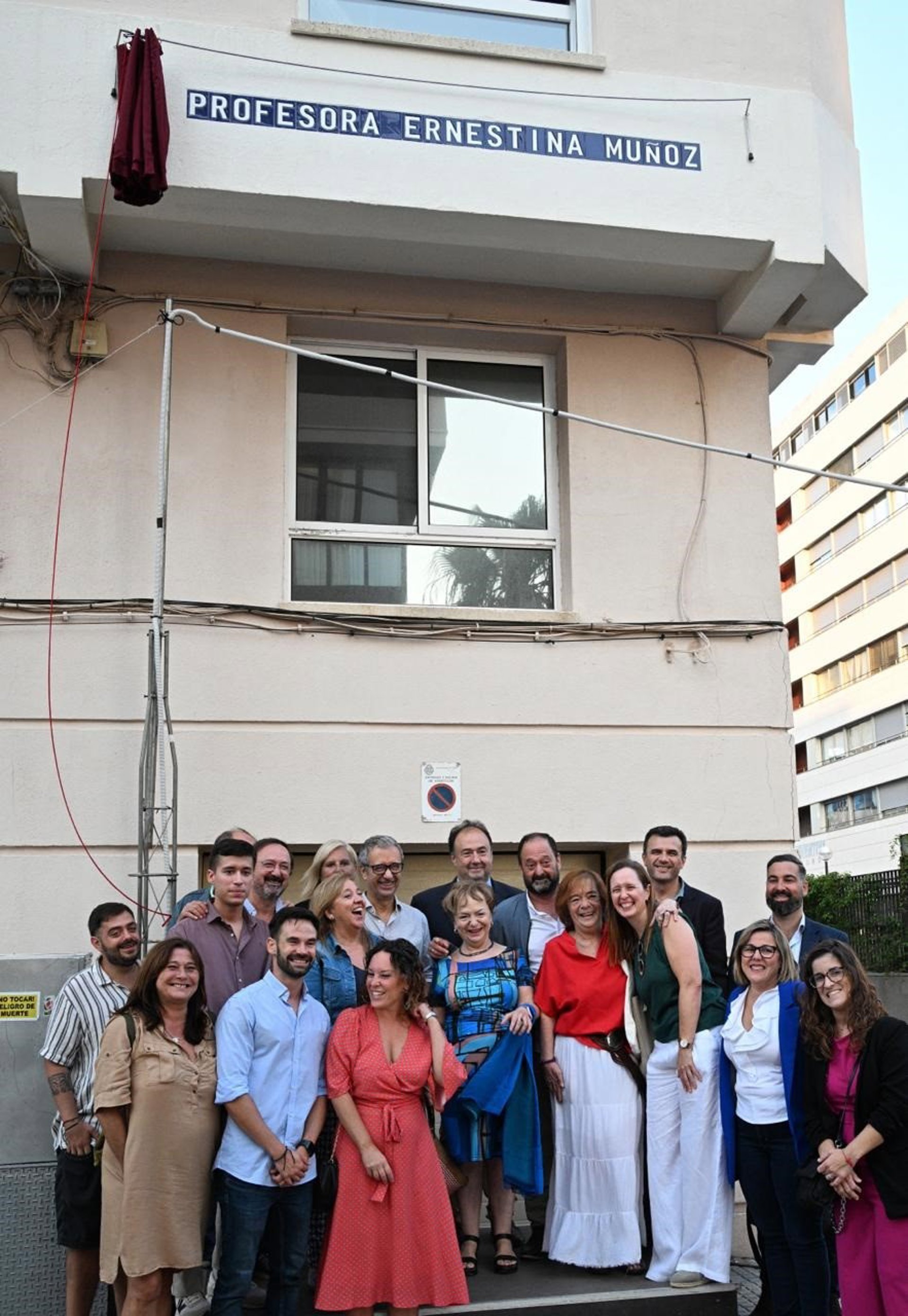 El alcalde de Cádiz, Bruno García, y la concejala de Participación Ciudadana, Loli Pavón, acompañados por el rector de la Universidad de Cádiz y familiares de la homenajeada, han participado en la tarde de este lunes en la develación de la placa de la calle dedicada a la profesora Ernestina Muñoz, en un emotivo acto que ha sido acompañado con la interpretaciones de piezas musicales.