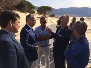 El subdelegado del Gobierno en Cádiz, Javier de Torre, acompañado del alcalde de Tarifa, Juan Andrés Gil (PP), del jefe de la Demarcación de Costas Andalucía Atlántico, Patricio Poullet, y de una representación de los vecinos afectados ha visitado este jueves en la localidad tarifeña los trabajos de retirada de arena de la duna de Valdevaqueros.