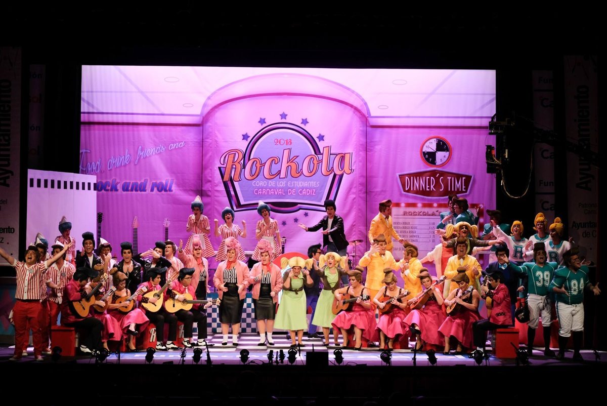 El coro 'Rockola', conocido como el coro de los estudiantes, abre este lunes las funciones de la fase de cuartos de final del Concurso Oficial de Agrupaciones Carnavalescas (COAC) que se celebra en el Gran Teatro Falla. En total serán 54 las agrupaciones que busquen el pase a la siguiente fase de semifinales, entre las que están diez coros, 21 comparsas, 19 chirigotas y cuatro cuartetos.