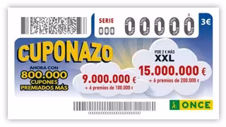 El 'Cuponazo' de la ONCE ofrece todos los viernes, por tres euros, un premio a las cinco cifras más serie de nueve millones de euros, y seis segundos premios de 100.000 euros a otras tantas extracciones, también con serie. Si se opta por el Cuponazo XXL, por cinco euros, el premio sube a 15 millones y 200.000 euros, respectivamente.