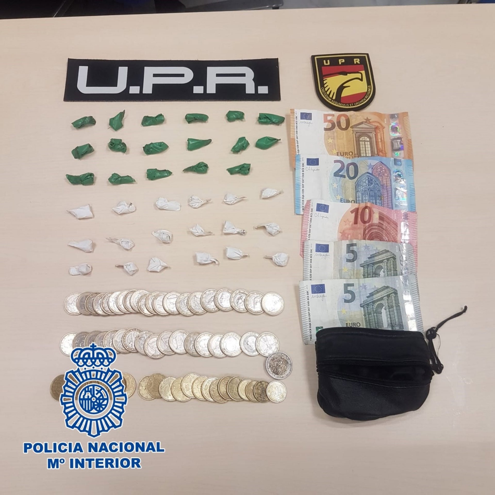 Al proceder bajar del vehículo al ser requerido por uno de los policías aprovechó la apertura de la puerta para arrojar el paquete que portaba en su mano al suelo, siendo observado por una agente integrante del operativo y pudo recuperar. Tras su plena identificación se pudo comprobar que lo oculto en el lateral del coche eran varios billetes arrugados y moneda fraccionada, concretamente 135,09 y el paquete arrojado al suelo con 35 papelinas de una sustancia, al parecer cocaína, con un peso total de 14,45 gramos.