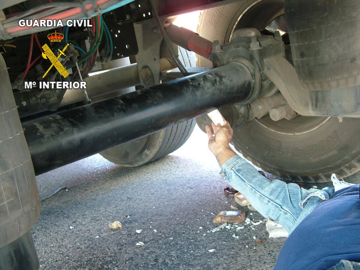 Así, durante la inspección pudieron comprobar con el videoscopio como el interior de los ejes de las ruedas gemelas del remolque estaban llenos de pastillas de hachís. Los agentes procedieron al vaciado de los ejes, hallando 143 pastillas de hachís de 150 gramos cada una envueltas en preservativos, arrojando un peso total de 21,400 kilos.