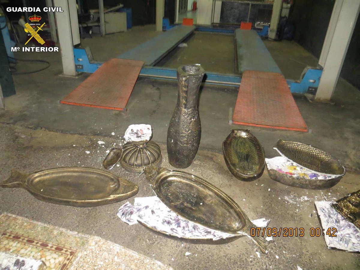 Así las cosas, al realizar la inspección de un vehículo que transportaba varias bolsas que contenían piezas de escayola, los agentes, al inspeccionar uno de los jarrones, descubrieron que el interior estaba lleno de bellotas de hachís, por lo que decidieron realizar una inspección minuciosa de todas sus piezas.