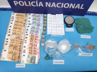 Durante las investigaciones, se comprobó también que el morador de la vivienda era un hombre y tras solicitar a la autoridad judicial competente la entrada y registro del domicilio, se procedió a su práctica, interviniendo un total de 10,3 gramos de heroína, 53,3 gramos de cocaína, 52 comprimidos de metadona de diferentes miligramos, así como 960 euros fraccionados en billetes y monedas, así como otros efectos y útiles relacionados con la actividad ilícita.