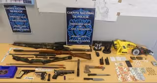 En el posterior registro, los agentes intervinieron varias armas, entre ellas tres pistolas, dos escopetas y armas desmontadas. Igualmente fueron aprehendidas numerosas dosis de cocaína, heroína y hachís dispuestas para su venta, dinero fraccionado y otros objetos de interés judicial.