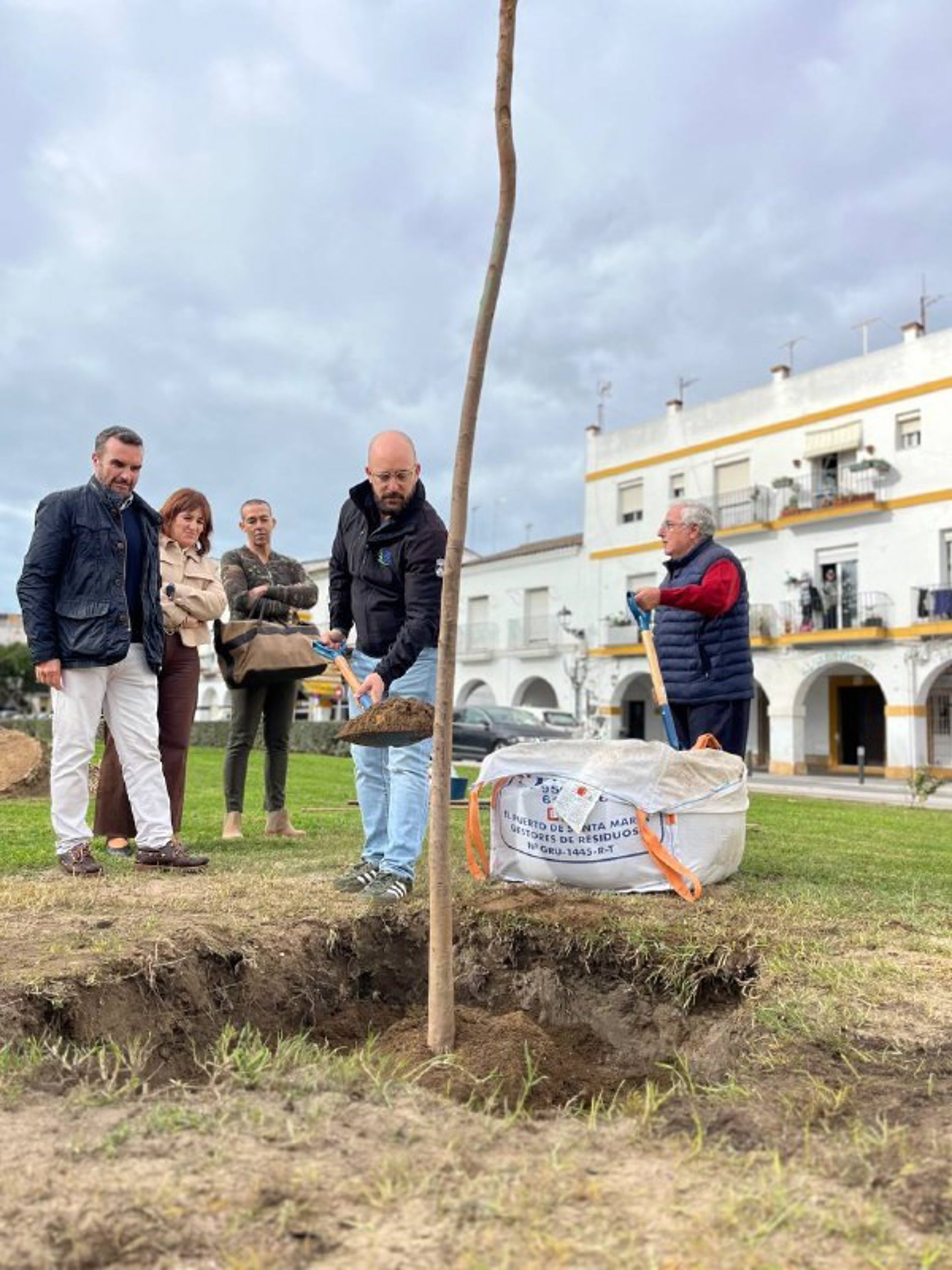 El alcalde de El Puerto de Santa María, Germán Beardo, durante la plantación de un eucalipto arcoíris, originario de Papúa-Nueva Guinea - AYUNTAMIENTO DE EL PUERTO