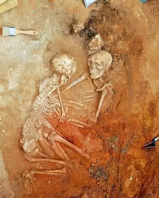 Se trata de dos individuos enterrados con la peculiaridad de que están mirando el uno hacia el otro y tienen entrelazados los miembros superiores e inferiores en actitud de abrazo, lo que indica que los enterraron a la vez y que quienes lo hicieron estaban convencidos de que existía entre ellos un vínculo afectivo.