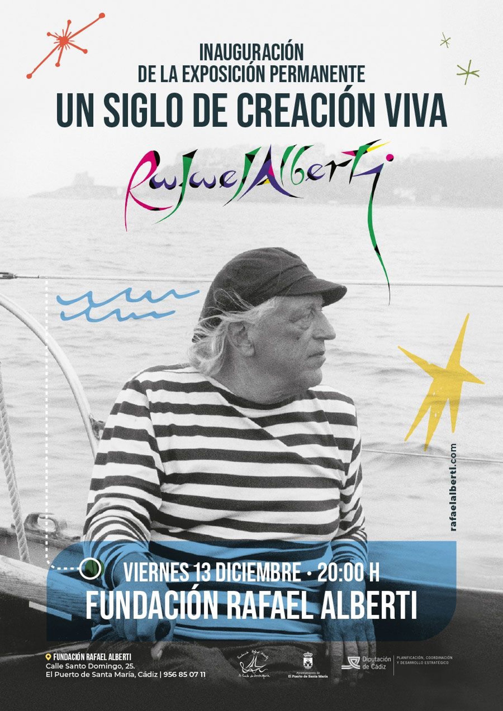 La exposición permanente sobre Rafael Alberti, 'Un siglo de creación viva', se inaugura de nuevo este viernes 13 de diciembre a las 20,00 horas en la Fundación que lleva el nombre del poeta en su ciudad natal de El Puerto de Santa María, en la provincia de Cádiz.