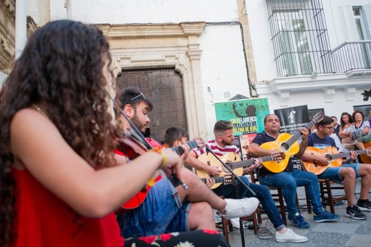 El II ciclo Caló Flamenco a la Fiesta de la Bulería de Jerez de la Frontera (Cádiz) ha celebrado un 'flashmob' de guitarra como preludio a su actual edición, a las puertas del Claustro de Santo Domingo y con la intervención de la academia de guitarra de José Ignacio Franco.