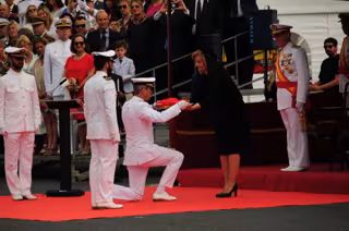 La fragata 'Cristóbal Colón' ha recibido este domingo en el puerto de Palos de la Frontera (Huelva) su Bandera de Combate de manos de La diputada nacional y anterior Ministra de Empleo y Seguridad Social, Fátima Báñez, siendo uno de los hitos más importantes en la vida operativa de un buque de guerra. La enseña ha sido ofrecida por el Ayuntamiento de Palos de la Frontera.
