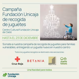 Fundación Unicaja ha lanzado una nueva campaña de recogida de juguetes nuevos para menores de familias vulnerables a beneficio de las asociaciones Cruz Roja, Nuevo Hogar Betania, Nuevo Futuro Cádiz y Fundación Márgenes y Vínculos. La iniciativa se desarrollará hasta el 23 de diciembre en el Centro Cultural Fundación Unicaja de Cádiz.
