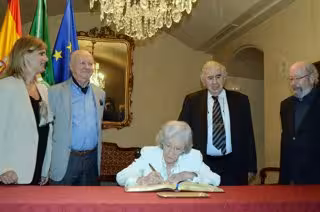 La regidora, como ya hiciera en la inauguración del Congreso, ha manifestado su satisfacción por el acontecimiento histórico de reunir a cuatro "grandes" de la literatura universal en el Ayuntamiento, Jorge Edwards, Ana María Matute, Antonio Gamoneda y el propio José Manuel Caballero Bonald, que están participando en esta decimoquinta edición del Congreso de la Fundación.
