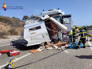 Autocaravana siniestrada en el accidente de la autovía de Los Barrios tras circular en sentido contrario - CONSORCIO PROVINCIAL DE BOMBEROS