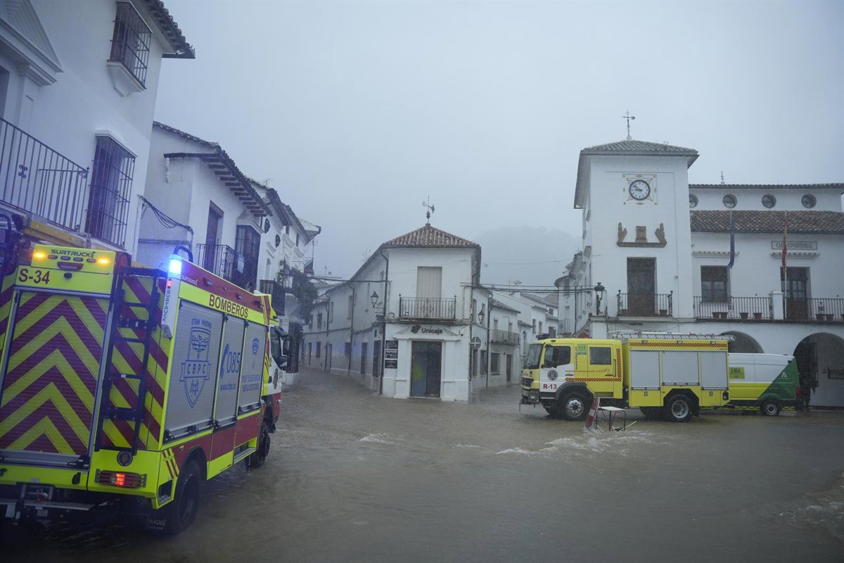 Archivo - Bomberos de la provincia de Cádiz trabajan en labores de achique de agua en calles y viviendas en la localidad gaditana de Grazalema tras el paso de la borrasca Leonardo. A 4 de febrero de 2026, en Grazalema, Cádiz (Andalucía, España). - Joaquín Corchero - Europa Press - Archivo