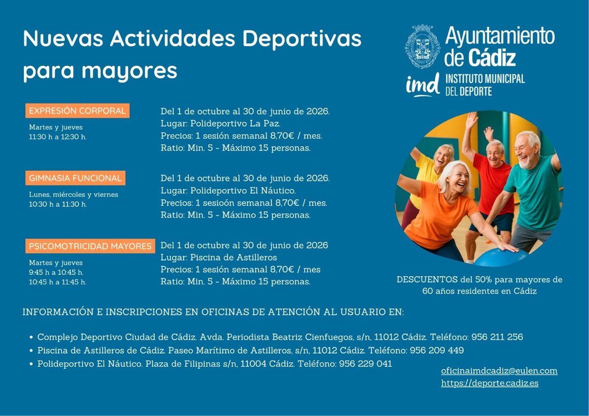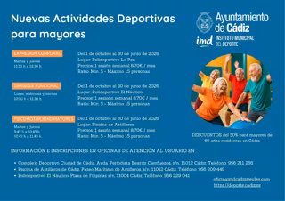 El Instituto Municipal del Deporte (IMD) del Ayuntamiento de Cádiz ofrece descuentos en actividades en sus instalaciones dirigidas a personas mayores con el objetivo de fomentar la actividad física, la socialización y el bienestar entre la población sénior de la ciudad.
