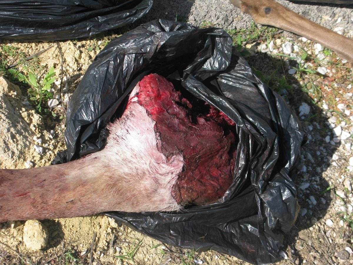 La patrulla lo localizó siguiendo las indicaciones de su compañero que lo estaba siguiendo. Una vez detuvieron el vehículo e identifican a sus tres ocupantes, los agentes localizaron cuatro bolsas conteniendo "patas de un ciervo recién abatidas sin poder acreditar su lícita procedencia".