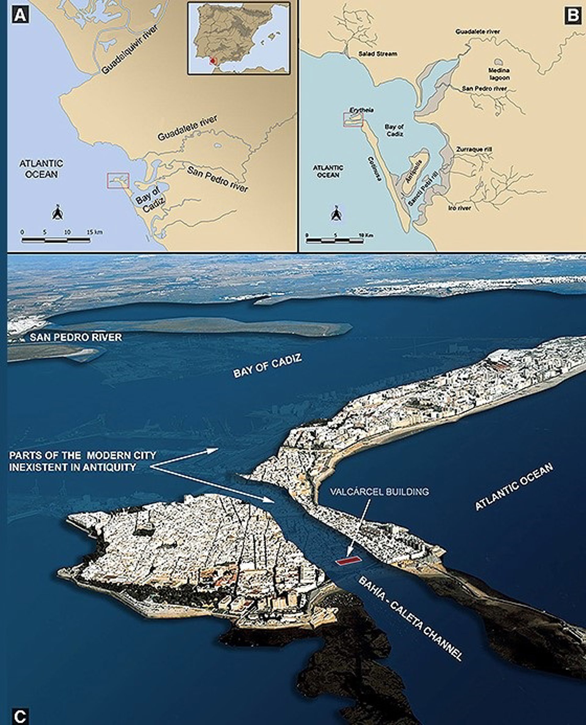 Expertos de la Universidad de Cádiz (UCA), coordinados por el catedrático del área de Arqueología, Darío Bernal-Casasola, y los investigadores José J. Díaz y Macarena Lara, del departamento de Historia, Geografía y Filosofía, han llevado a cabo diversos trabajos en el edificio Valcárcel, centro del antiguo paleocanal Bahía-Caleta, situado entre las islas Erytheia y Cotinusa en el antiguo archipiélago de Cádiz, que han permitido identificar los restos de un puerto fenicio-púnico y romano.