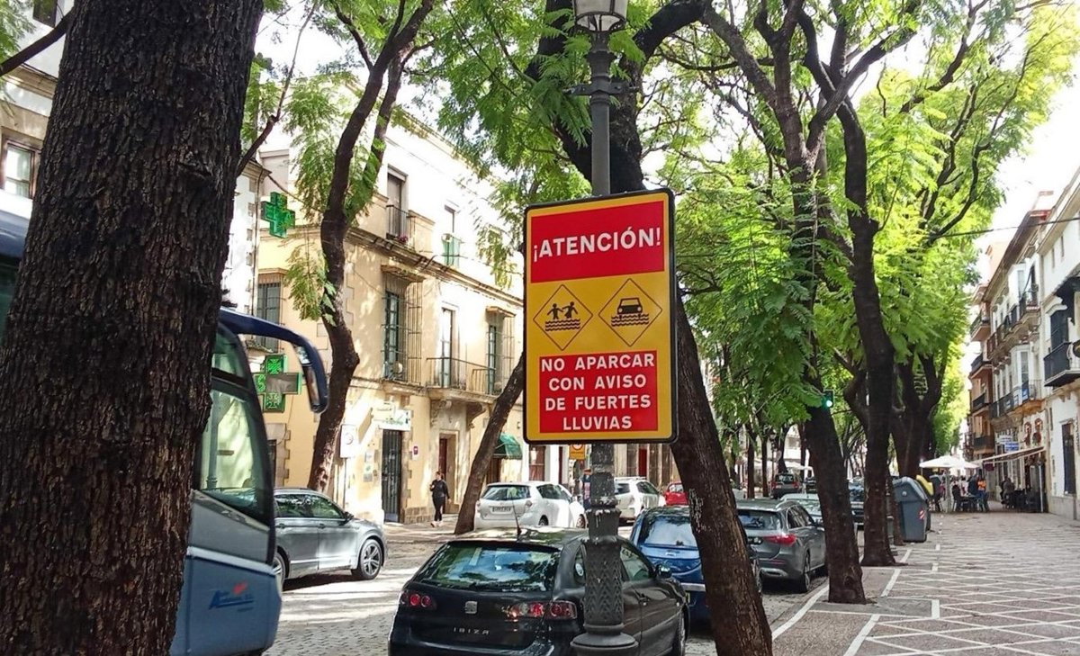 Cartelería avisando de indicaciones ante fuertes lluvias en el centro urbano de Jerez. - AYUNTAMIENTO DE JEREZ